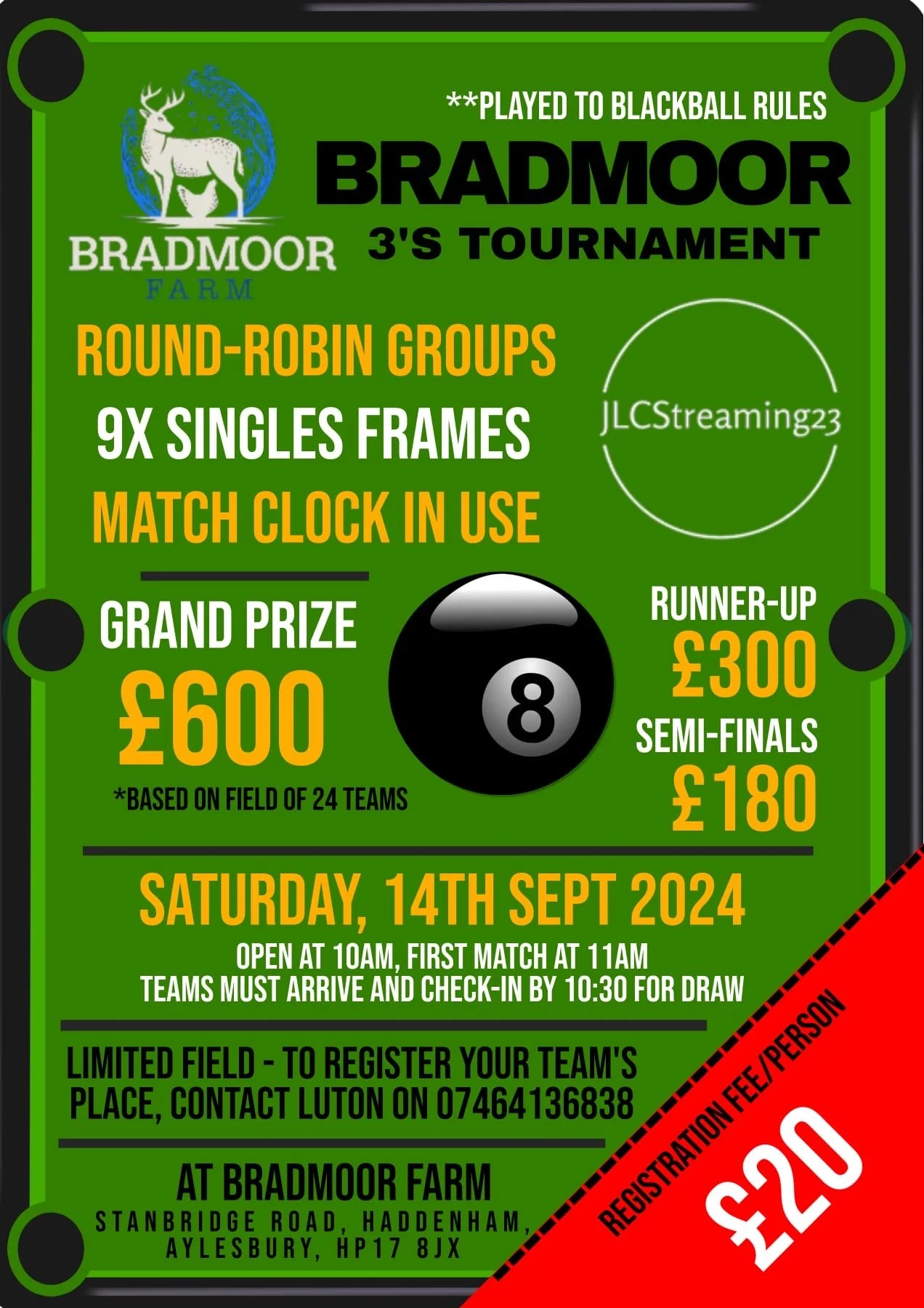 POOL 3'S TOURNAMENT Saturday 14 September 2024 10:00 23:30 Bradmoor Farm Sport's Bar Stanbridge Road Aylesbury, England, HP17 8JX United Kingdom (map) Google Calendar ICS